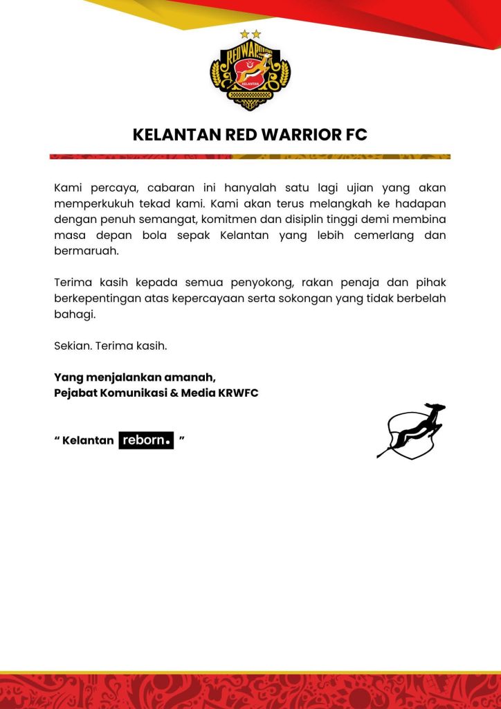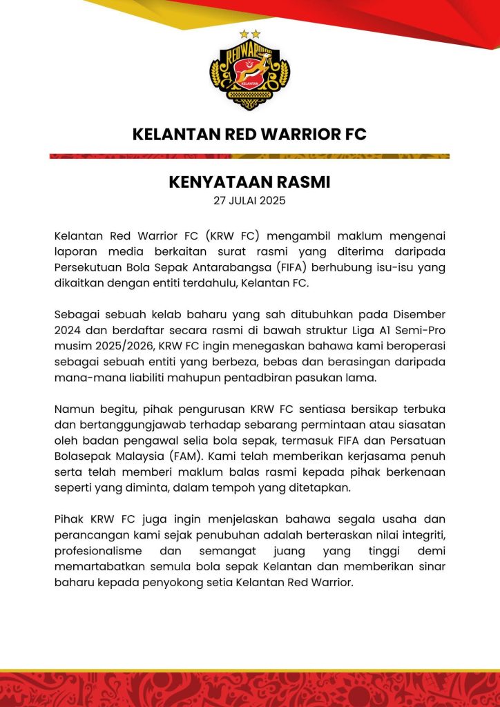 Liga Malaysia Media Tempatan TRWC KRW FC bukan Entiti Lama TRWC Read Time:5 Second KENYATAAN RASMI KELANTAN RED WARRIOR FC : Isu Berkaitan FIFA & Entiti Kelantan FC 27 Julai 2025. Share Facebook Twitter Author TRWC https://theredwarriors.com Post Navigation Previous SENARAI PENUH PEMAIN KRW FC 25/26 !Next Pemilik Naskeen Coffee, CEO baru KRWFC More Stories Komuniti Media Tempatan TRWC KRW FC dibenarkan beraksi dalam saingan Liga A1? TRWC Liga Malaysia TRWC Selepas pemilikan, Logo KRW FC pula timbul masalah? TRWC Komuniti Liga Malaysia TRWC Sah! KRW FC bebas sekatan FIFA. TRWC
